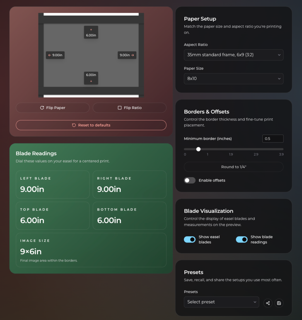 the highlight feature of dorkroom is the border calculator, which aims to help folks printing in the darkroom get accurate borders that maintain the aspect ratios and desired border sizes they want