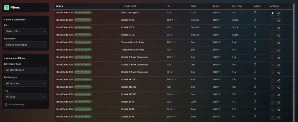 the most involved feature is the development recipe page, which lists hundreds (soon to be thousands) of film development recipes for all sorts of black and white films and developers